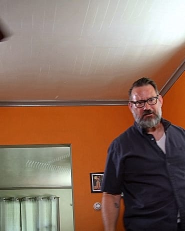 Anastasia is desperate to pee when the handyman comes by to fix her AC. She shows him to it and then excuses herself to go to the bathroom but she trips over his tool bag and hurts herself. She begs him to help her to the bathroom but she's too hurt and can't stand even with his help. Finally, much to his embarrassment, she convinces him to strip her out of her pants and get a bowl from the kitchen, lifting her up and holding her over the bowl so she can pee.