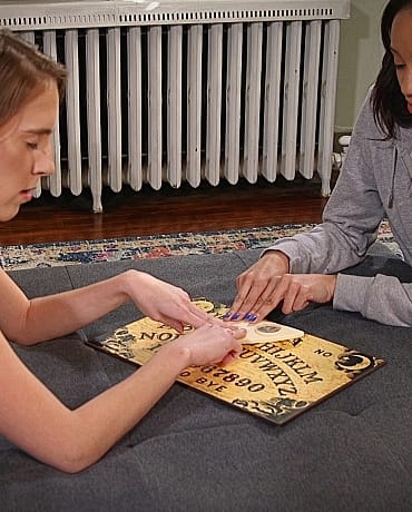 When Cadence and Alexis decide to play with a Ouija board they end up getting possessed by two horny ghosts who have a great time stripping them down and exploring their hot female bodies together.