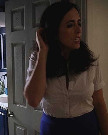 A real estate agent who is desperate to pee can't hold it anymore when her client won't stop asking questions and ends up peeing in a glass from the kitchen sink right in front of him, much to her humiliation.