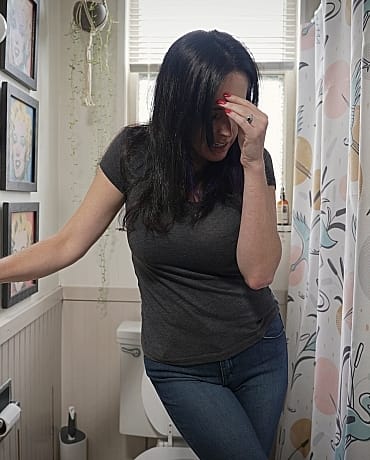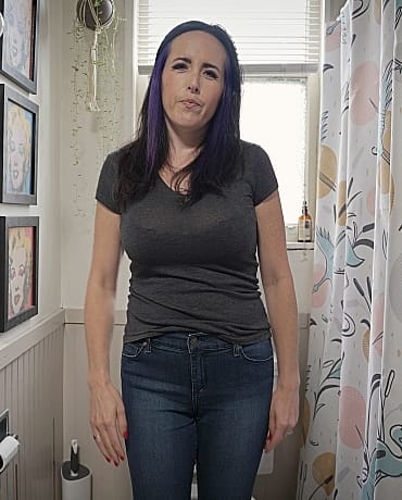 Tina has been drinking a bunch of soda but you won't let her pee. Even after you get home and she gets to the bathroom you still won't let her go, making her dance around and grab her crotch in desperation right in front of the toilet. Finally you make her pull down her jeans and show you her pussy and ass before having her sit bare assed on the toilet but still not allowed to pee. The desperation is intense and finally she can't take it anymore.